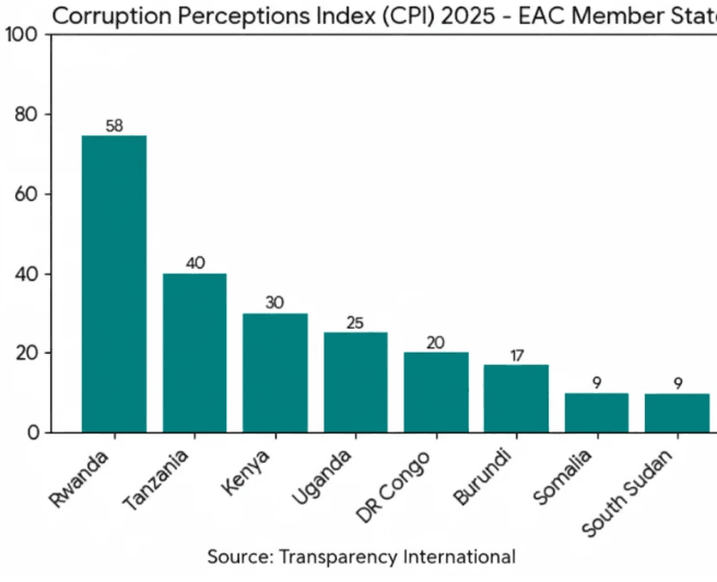 The index indicates that corruption remains deeply entrenched across parts of East and Central Africa. Uganda and the Democratic Republic of Congo were cited among countries experiencing high corruption levels, while Burundi recorded very high corruption perceptions. Somalia and South Sudan were ranked among nations in a critical state, reflecting severe governance and accountability challenges.